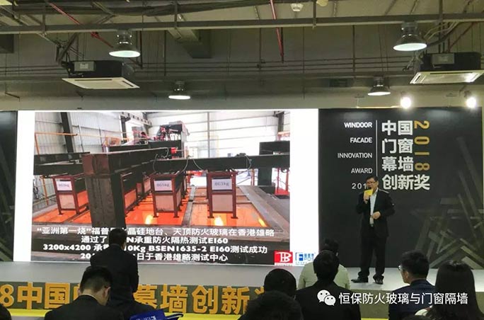 在本次展會(huì)中,恒?!じF账脊究偨?jīng)理陳沃林還參加了“2018中國(guó)門(mén)窗幕墻創(chuàng)新獎(jiǎng)--星品發(fā)布會(huì)” 活動(dòng),演講主題為“防火玻璃地臺(tái)采光頂?shù)臏y(cè)試與應(yīng)用”,獲得了現(xiàn)場(chǎng)聽(tīng)眾的肯定與支持,并在會(huì)后解答了各方來(lái)客的問(wèn)題。