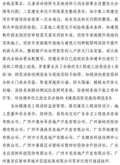 近期,廣州市住房和城鄉(xiāng)建設(shè)局在辦理建設(shè)工程消防設(shè)計(jì)審查驗(yàn)收工作中發(fā)現(xiàn),大部分施工圖審查機(jī)構(gòu)、建設(shè)、設(shè)計(jì)、施工、監(jiān)理、檢測(cè)單位能夠嚴(yán)格執(zhí)行國(guó)家、地方消防技術(shù)標(biāo)準(zhǔn)規(guī)范,但也存在一些不容忽視的問(wèn)題。存在的主要問(wèn)題有: - 一是施工圖審查機(jī)構(gòu)未嚴(yán)格按照消防法律法規(guī)、消防技術(shù)標(biāo)準(zhǔn)規(guī)范和《建設(shè)工程消防設(shè)計(jì)審查規(guī)則》(GA1290-2016)開(kāi)展消防設(shè)計(jì)文件審查,如已審查合格的部分工程仍存在對(duì)廠房的火災(zāi)危險(xiǎn)性定性錯(cuò)誤、消防車道設(shè)置不符合規(guī)范要求、兒童活動(dòng)場(chǎng)所與其他場(chǎng)所之間未按要求設(shè)置防火分隔等問(wèn)題。