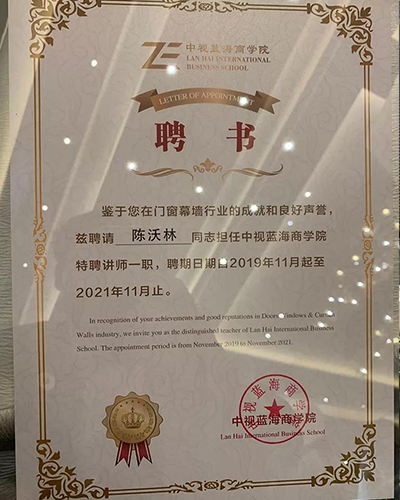 同期11月5日,恒保再獲中國(guó)門窗百?gòu)?qiáng)企業(yè)稱號(hào)!而恒??偨?jīng)理陳沃林先生成為中視藍(lán)海商學(xué)院的特聘講師!