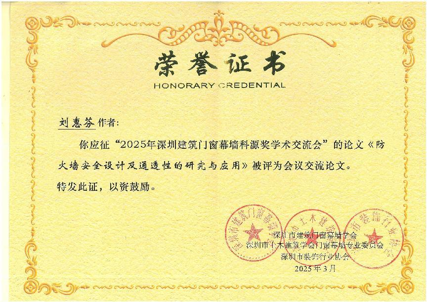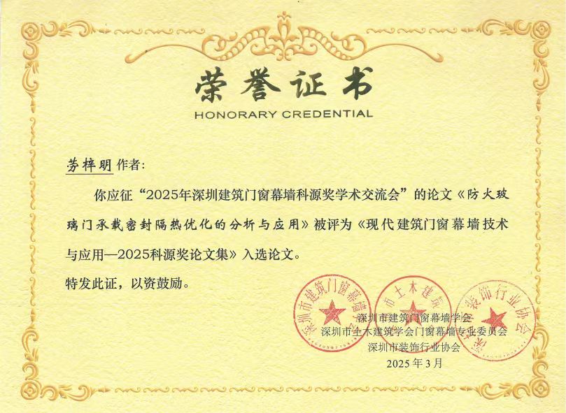 在2025科源獎(jiǎng)獲獎(jiǎng)學(xué)術(shù)論文及學(xué)術(shù)交流先進(jìn)單位頒獎(jiǎng)儀式中,恒保公司共3篇論文榮獲學(xué)會(huì)表彰,其中工程師勞梓明撰寫的《防火玻璃門承載密封隔熱優(yōu)化的分析和應(yīng)用》被評(píng)為《現(xiàn)代建筑門窗幕墻技術(shù)與應(yīng)用——2025科源獎(jiǎng)?wù)撐募啡脒x論文!